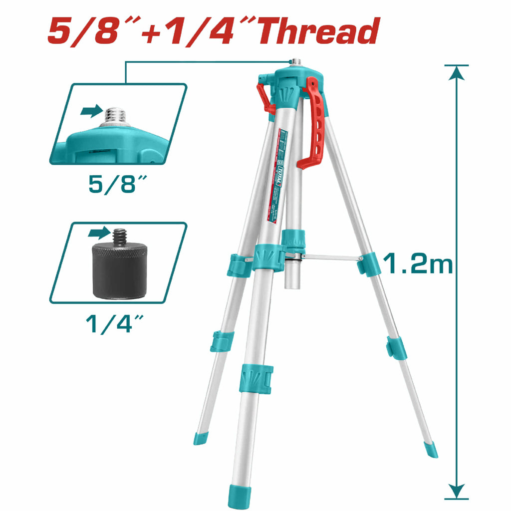 Trípode de Aluminio 1/2m. Tuerca 5/8” y 1/4”, Peso 1.0Kg. Para niveles laser TLL156508, TLL306505, TLL305205. Presentación Caja.
