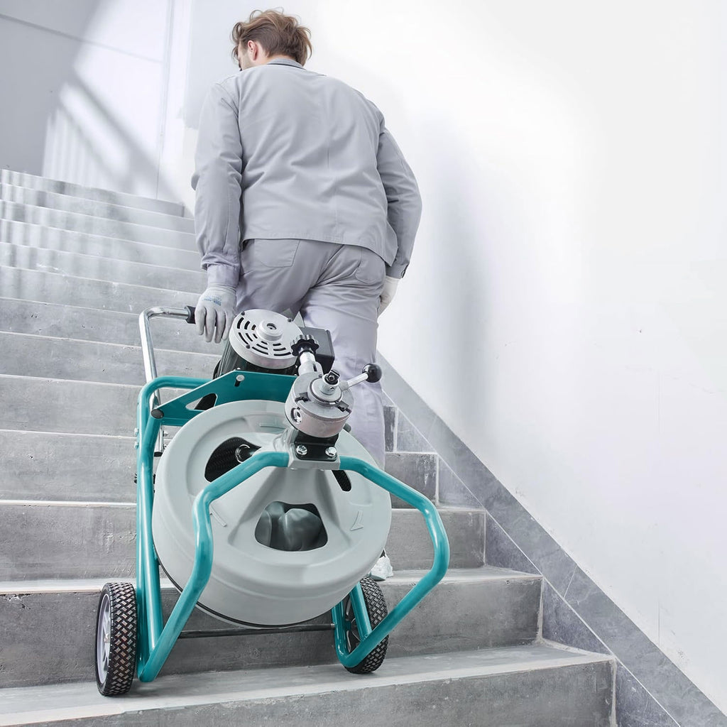 - Portátil y ahorra espacio: llévalo a cualquier lugar, guárdalo con facilidad. Esta máquina de limpieza de desagües está equipada con ruedas de 7.5 pulgadas, lo que permite un movimiento sin esfuerzo. El mango plegable proporciona un agarre cómodo, mientras que hace que sea conveniente para almacenar cuando no está en uso.